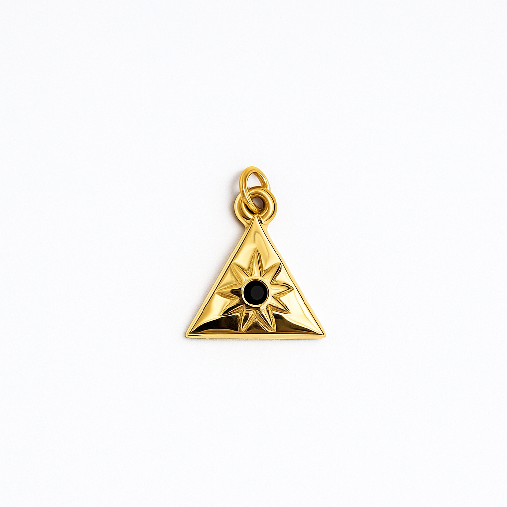 Let the stars guide your sparkle with the Cosmic Wink Charm! Shaped like a radiant golden triangle with a bold black center and a dazzling starburst design, this charm is your little beacon of celestial cool. Whether you’re into moon phases, cosmic vibes, or just love a hint of mystery, this 18K gold-plated piece adds a touch of the universe to your stack. One charm, infinite energy.