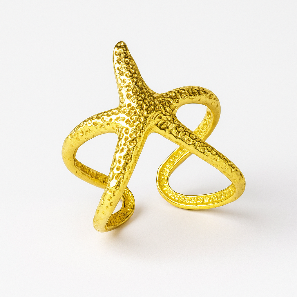 Product Description: Embrace organic elegance with our Hammered Gold Starburst Cuff Ring. This eye-catching ring features an intricate, open design that flows gracefully around the finger, evoking the natural beauty of a starfish or a dynamic starburst. The rich 18K gold Plated metal is artfully hammered, creating a captivating texture that gleams with every movement. Designed as an adjustable cuff rings, it offers both comfort and a truly unique aesthetic, making it an ideal accessory for adding a touch of sophisticated artistry to any ensemble.