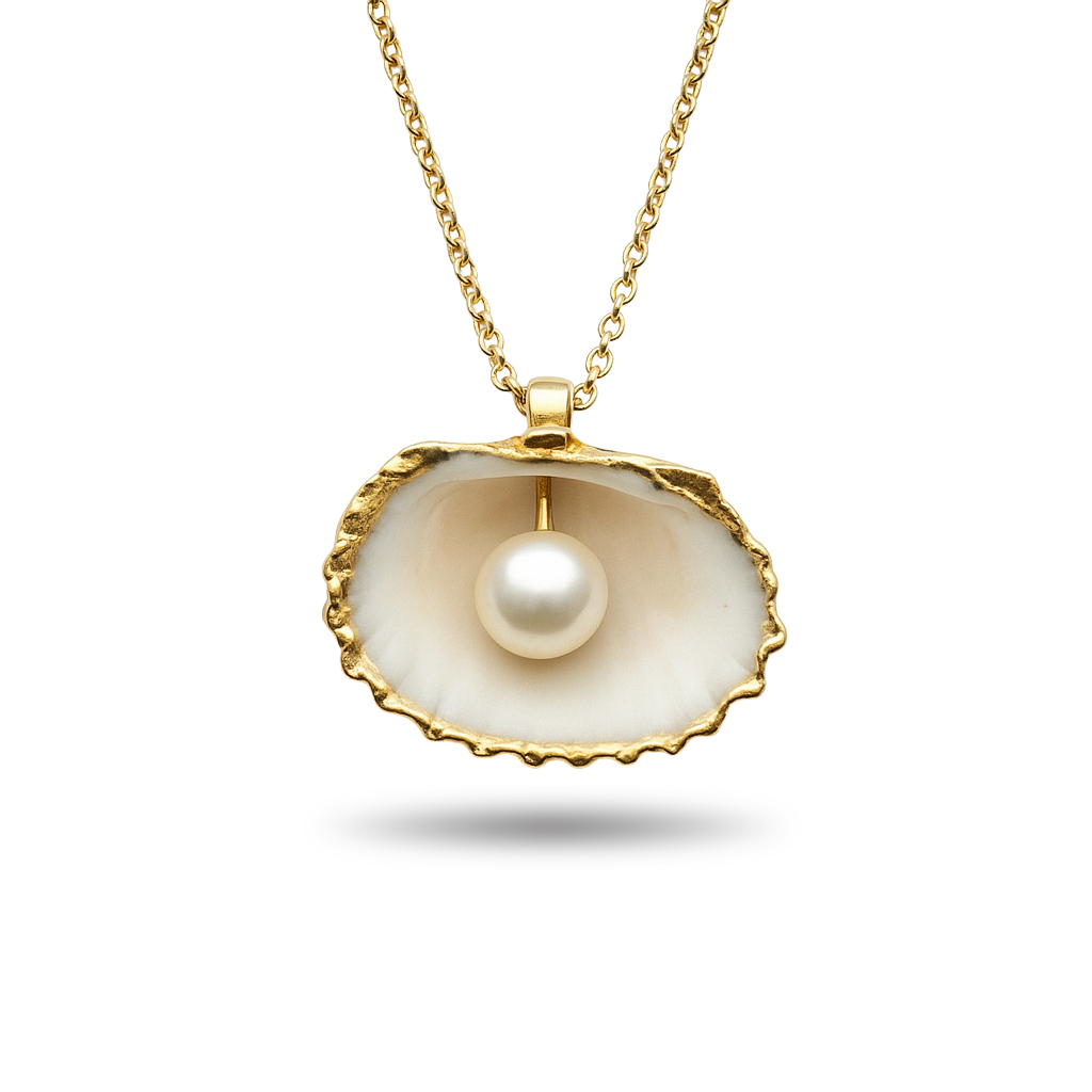 Product Description: Discover a treasure from the deep with our exquisite Pearl in Oyster Shell Necklace. This enchanting 18K gold Plated pendant meticulously depicts an open oyster shell, revealing a perfectly round, lustrous pearl nestled within. The shell’s natural, textured edges are beautifully rendered in polished gold, creating a captivating contrast with the smooth, iridescent pearl. Suspended from a delicate 18K gold Plated chain, this unique necklace symbolizes hidden beauty and precious discoveries, making it a truly special and elegant statement piece.