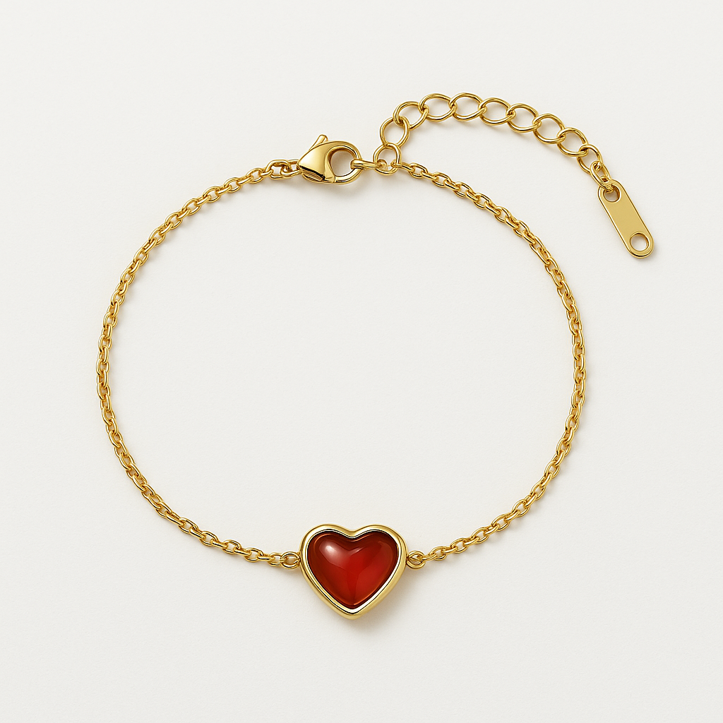 Product Description: Express your affection with our Golden Chain with Ruby Red Heart Bracelet. This enchanting piece features a vibrant, polished ruby red heart, set within a delicate 18K gold Plated bezel and suspended gracefully from a slender golden chain. Symbolizing love and passion, this bracelet is perfect for adding a pop of romantic color and refined elegance to your everyday look or as a thoughtful gift for someone special. It comes with a secure lobster clasp and an adjustable extender for a perfect fit.