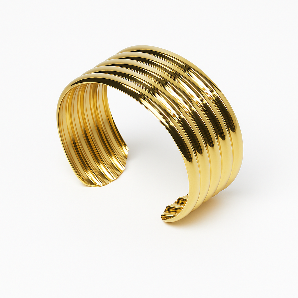 Product Description: Add a touch of textured chic to your style with our Sunbeam Groove Gold Cuff. This eye-catching bracelet features a radiant 18K gold Plated finish with distinct, parallel grooves that create a dynamic and tactile appeal. Its wide, open-back design provides a secure yet comfortable fit, making it an ideal choice for those who appreciate bold accessories with refined details.