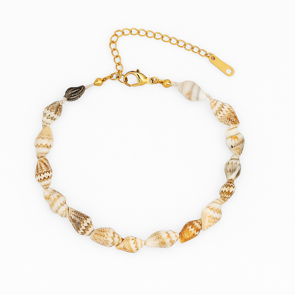 Product Description: Feel the whisper of the waves with our Whispering Sands Shell Bracelet. This delicate string of natural, variegated seashells is a tactile reminder of sun-drenched beaches and ocean adventures. Secured with a golden chain and adjustable clasp, it’s the perfect accessory to infuse your look with summery vibes and a hint of wanderlust.